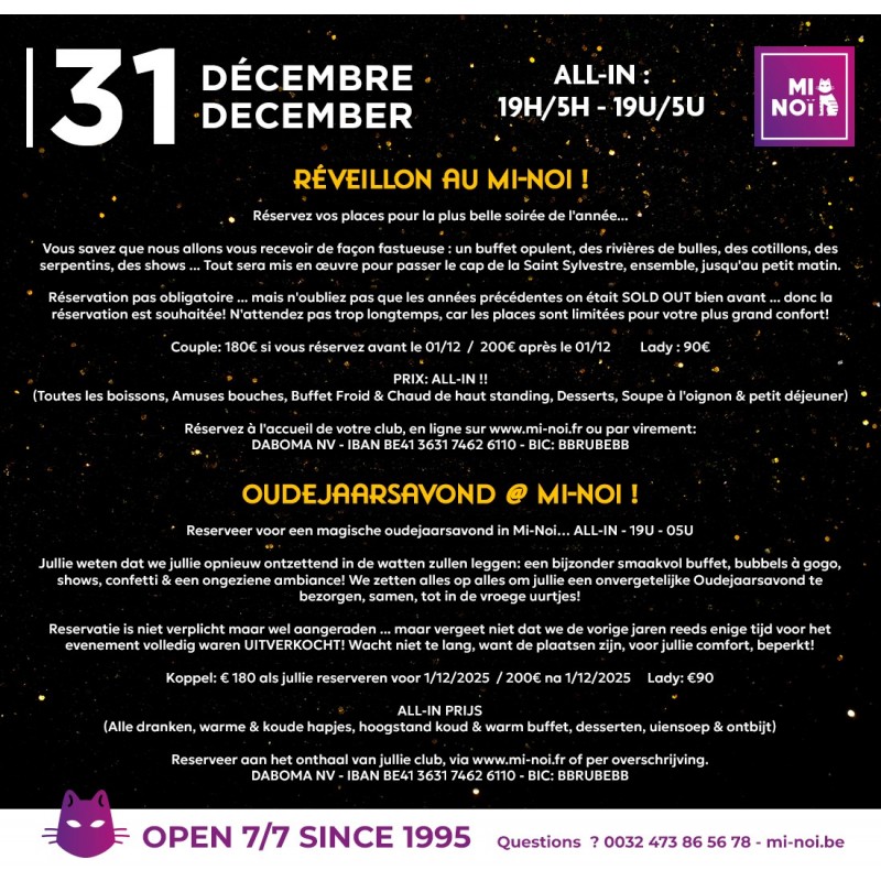 Vous savez que nous allons vous recevoir de façon fastueuse: un buffet opulent, des rivières de bulles, des cotillons, des serpentins, des shows ... Tout sera mis en œuvre pour passer le cap de la Saint Sylvestre, ensemble, jusqu'au petit matin.